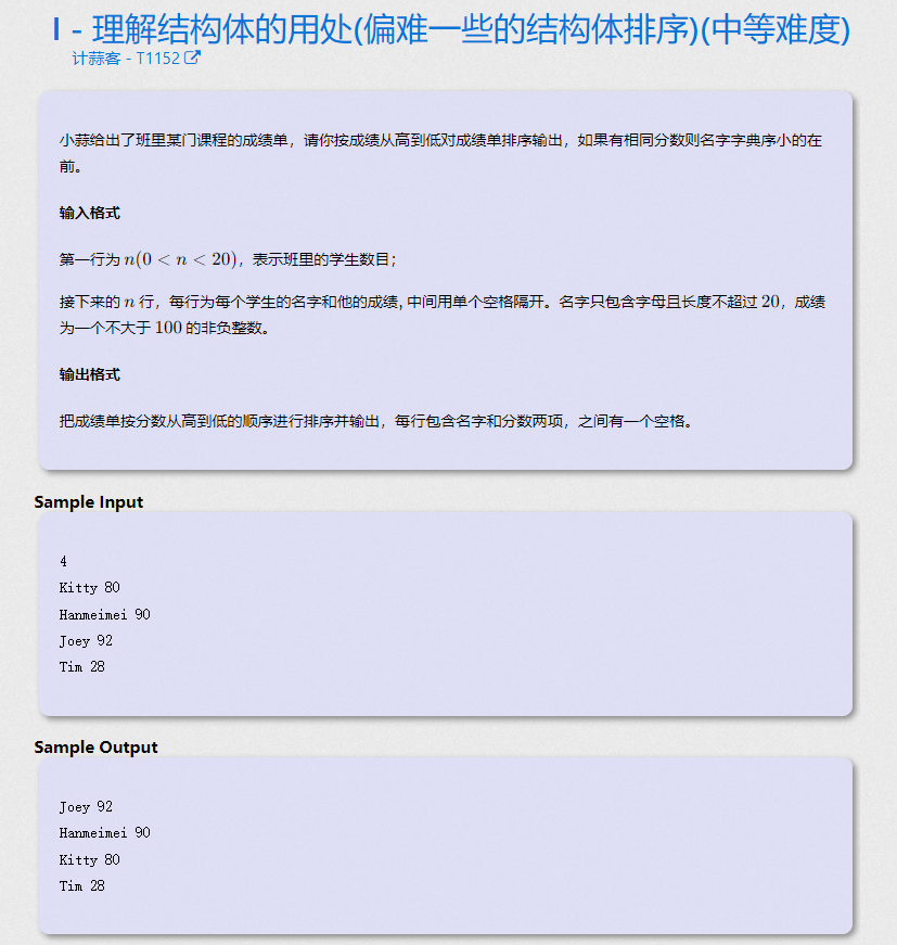 结构体排序 题目:小蒜给出了班里某门课程的成绩单,请你按成绩从高到低对成绩单排序输出,如果有相同分数则名字字典序小的在前。输入格式第一行为n(0 < n < 20)n(0<n<20),表示班里的学生数目;接下来的nn行,每行为每个学生的名字和他的成绩, 中间用单个空格隔开。名字只包含字母且长度不超过2020,成绩为一个不大于100100的非负整数。输出格式把成绩单按分数从高到低的顺序进行排序并输出,每行包含名字和分数两项,之间有一个空格。Sample Inpu...