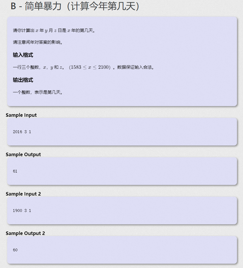 C语言计算今年第几天 题目描述:请你计算出xx年yy月zz日是xx年的第几天。请注意闰年对答案的影响。输入格式:一行三个整数,xx,yy和zz。(1583\le x\le 21001583≤x≤2100)。数据保证输入合法。输出格式:一个整数,表示是第几天。输入样例1:2016 3 1输出样例1:61输入样例2:1900 3 1输出样例2:60解题思路:先输入年月日,再根据年份判断为闰年还是平年,再根据每月的天数运用暴力手段计算出第几天,注意...