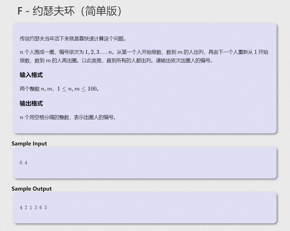 C语言约瑟夫环(简单版) 传说约瑟夫当年活下来就是靠快速计算这个问题。n个人围成一圈,编号依次为1,2,3…n。从第一个人开始报数,数到m的人出列,再由下一个人重新从1开始报数,数到m的人再出圈。以此类推,直到所有的人都出列。请输出依次出圈人的编号。输入格式两个整数n,m,1≤n,m≤100。输出格式n个用空格分隔的整数,表示出圈人的编号。输入样例:6 4输出样例:4 2 1 3 6 5解题思路:先输入人数和出圈的数,定义一个数初始化为0用来计数,同时作为循环条件,再定义一...
