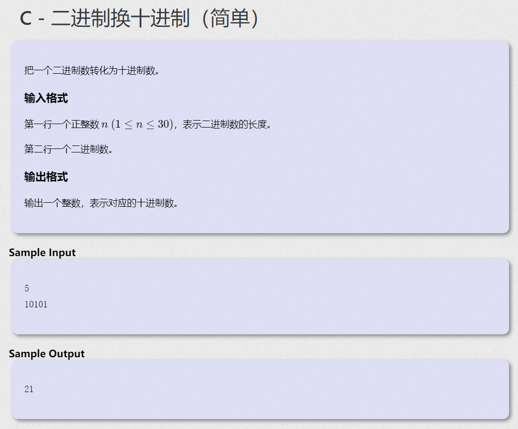 C语言二进制换十进制(简单) 题目描述:把一个二进制数转化为十进制数。输入格式:第一行一个正整数n( 1 ≤n ≤30 ),表示二进制数的长度。第二行一个二进制数。输出格式:输出一个整数,表示对应的十进制数。输入样例:510101输出样例:21做题思路:先确定二进制数长度,注意输入完成后的回车要用getchar()函数给吃掉,之后初始化为0一个数,先让其乘二,再让二进制数的每一位与'0'做差并加入其中,最后输出。#include<stdio.h>int main...