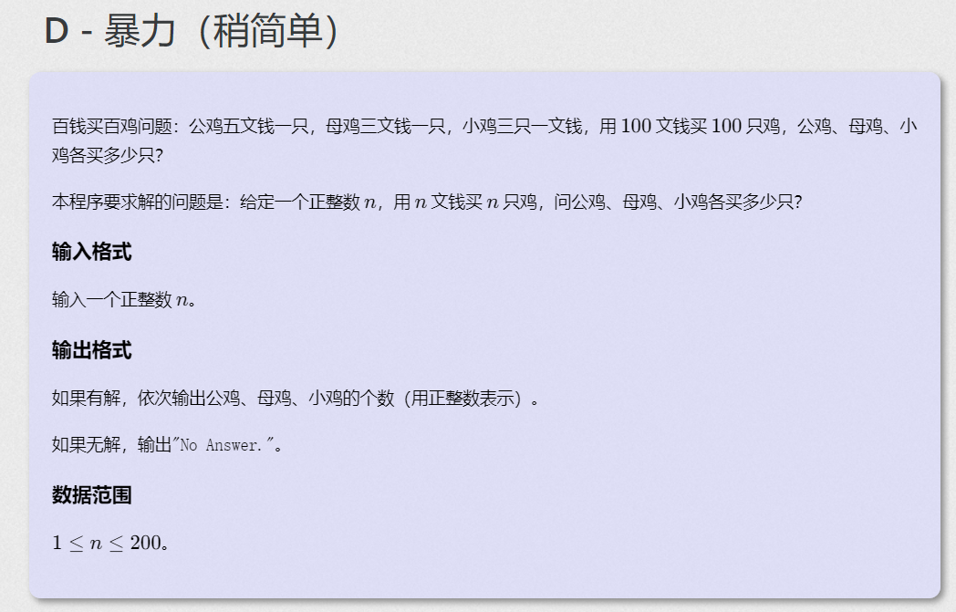 C语言暴力(稍简单) 题目描述:百钱买百鸡问题:公鸡五文钱一只,母鸡三文钱一只,小鸡三只一文钱,用100100文钱买100100只鸡,公鸡、母鸡、小鸡各买多少只?本程序要求解的问题是:给定一个正整数nn,用nn文钱买nn只鸡,问公鸡、母鸡、小鸡各买多少只?输入格式:输入一个正整数nn。输出格式:如果有解,依次输出公鸡、母鸡、小鸡的个数(用正整数表示)。如果无解,输出"No Answer."。数据范围:1≤n≤200。输入样例:100输出样例:0 25 7...