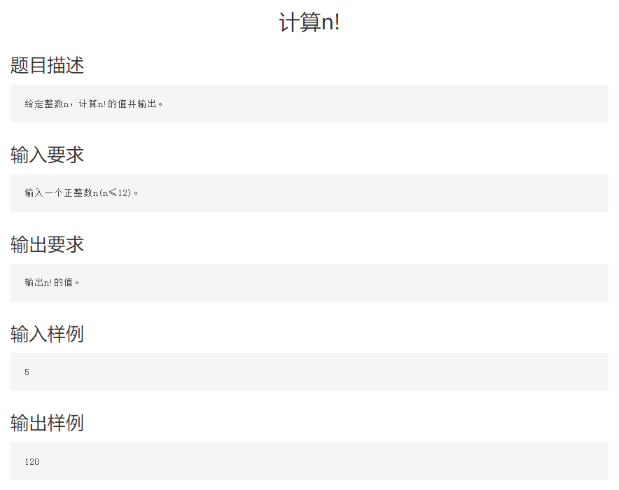 C语言计算n的阶乘 题目描述:给定整数n,计算n!并输出。输入要求:输入正整数n(n≤12)。输出要求:输出n!的值。输入样例:5输出样例:120解题思路:让数字从1累乘到n,即先定义x=1,从1开始不断加1累乘#include <stdio.h> int main(){ int n,i; int x=1; scanf("%d",&n); for(i=1;i<=n;i++) x*=i;//累乘 printf("%d",x); return 0; }