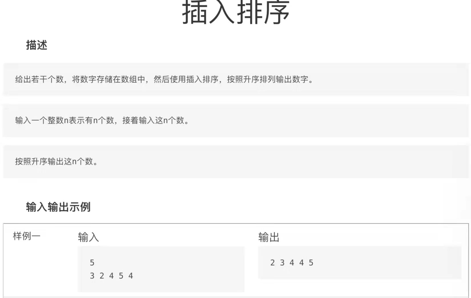 C语言插入排序 描述:给出若干个数,将数字存储在数组中,然后使用插入排序,按照升序排列出输出数字。输入一个整数n表示有n个数,接着输入这n个数。按照升序输出这n个数。输入输出示例:输入:53 2 4 5 4输出:2 3 4 4 5#include<stdio.h>int main(){ int n; scanf("%d",&n);//输入n以确定接下来可输入的数字个数 int m; int a[n]; int l; for(l=0;l<n;l++