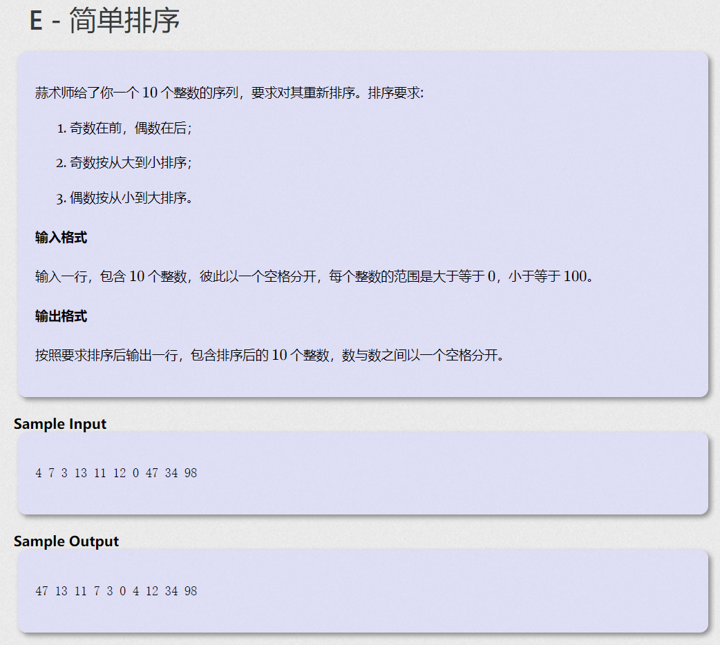 C语言简单排序 题目描述:蒜术师给了你一个10个整数的序列,要求对其重新排序。排序要求: 奇数在前,偶数在后; 奇数按从大到小排序; 偶数按从小到大排序。 输入格式:输入一行,包含10个整数,彼此以一个空格分开,每个整数的范围是大于等于0,小于等于100。输出格式:按照要求排序后输出一行,包含排序后的10个整数,数与数之间以一个空格分开。输入样例:4 7 3 13 11 12 0 47 34 98输出样例:47 13 11 7 3 0 4 1...