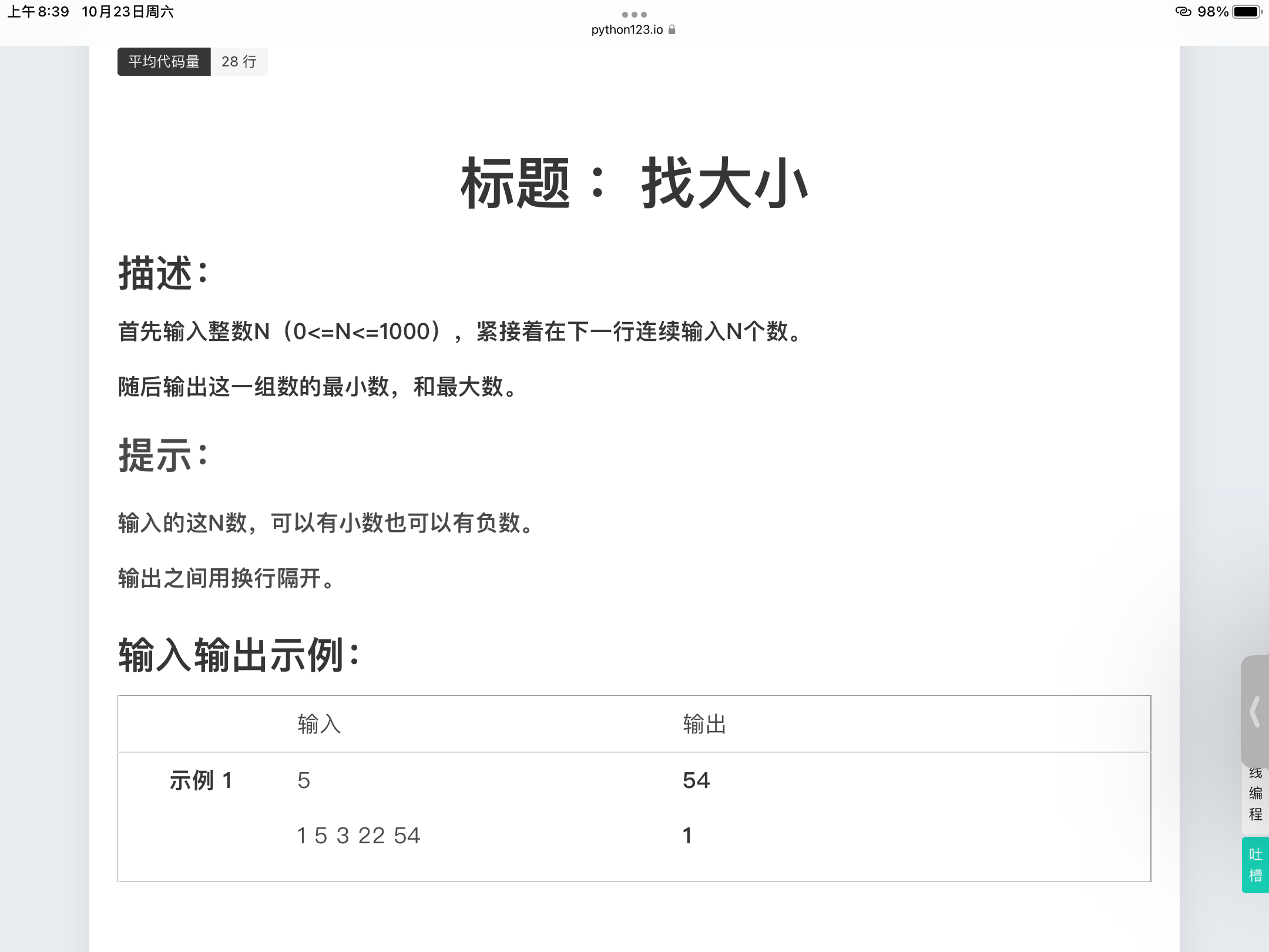 C语言找大小 描述:首先输入一个整数N(0<=N<=100),紧接着在下一行连续输入N个数。然后输出这一组数的最小数,和最大数。提示:输入的这N数,可以有小数也可以有负数。输出之间用换行隔开。输入输出示例:输入:51 5 3 22 54输出:154#include<stdio.h>int main(){ int N; scanf("%d",&N);//输入可输入的数字个数 float M; int i; float a[N].