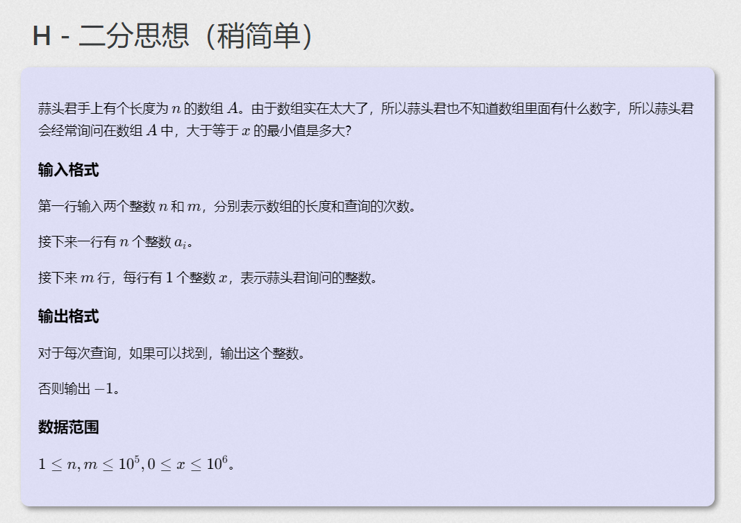 C语言二分思想(稍简单) 题目描述:蒜头君手上有个长度为n的数组A。由于数组实在太大了,所以蒜头君也不知道数组里面有什么数字,所以蒜头君会经常询问在数组A中,大于等于x的最小值是多大?输入格式:第一行输入两个整数n和m,分别表示数组的长度和查询的次数。接下来一行有n个整数 ai。接下来m行,每行有1个整数x,表示蒜头君询问的整数。输出格式:对于每次查询,如果可以找到,输出这个整数。否则输出−1。数据范围:1≤n,m≤105,0≤x≤106。输入样例...