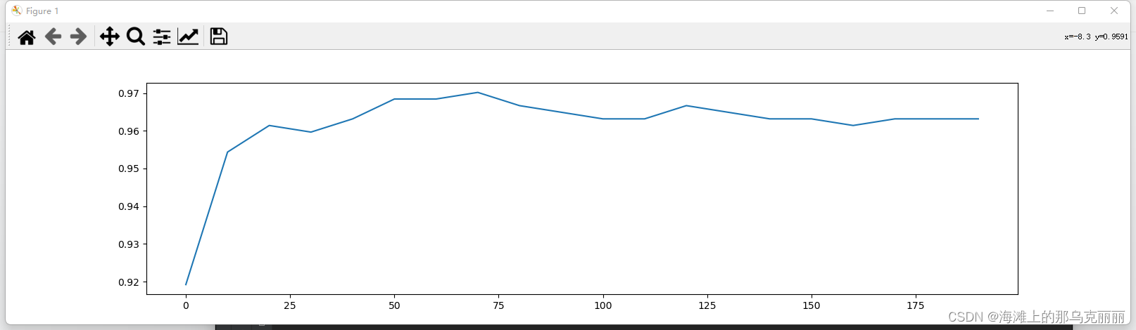 上述代码的意思时,先用200颗树训练随机森林,训练完成后打印一下训练20次的分数并存放到列表中,画一个学习曲线图,发现在训练到71棵树时,平均分值最高。