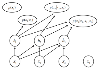 但线性模型容量有限,拟合函数的能力不足。在神经自回归网络中,使用神经网络代替线性模型,它可以任意增加容量,理论上可以拟合任意联合分布。神经自回归网络还使用了特征重用的技巧,神经网络从观察变量 xi 学习到的隐藏抽象特征 hi 不仅在计算p(xi+1|xi,xi-1,...,x1)时使用,也会在计算p(xi+2|xi+1,xi,...,x1)时进行重用,其计算图如下所示,并且该模型不需要将每个条件概率的计算都分别使用不同神经网络表示,可以将所有神经网络整合为一个,因此只要设计成抽象特征hi只依赖于x1,x2,...,xi即可。而目前的神经自回归密度估计器是神经自回归网络中最具有代表性的方案,它是在神经自回归网络中引入了参数共享的方案,即从观察变量xi到任意隐藏抽象特征 hi+1,hi+2,... 的权值参数是共享的,使用了特征重用、参数共享等深度学习技巧的神经自回归密度估计器具有非常优秀的性能。