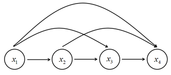 自回归网络是最简单的完全可见置信网络,其中每一个维度的观察变量都构成概率模型的一个节点,而这些所有的节点{x1,x2,...,xn}共同构成一个完全有向图,即图中任意两个节点都存在连接关系,如图所示。