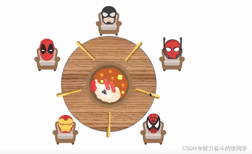 一张圆桌上坐着5名哲学家,每两个哲学家之间的桌上摆一根筷子,桌子的中间是一碗米饭。哲学