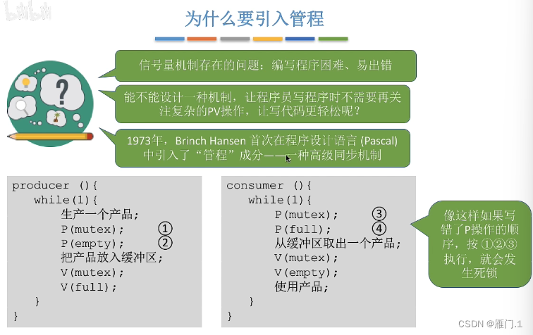 管程与死锁 (1)管程中定义的共享数据结构只能被管程中定义的函数进行修改,想要修改共享数据结构只能进行函数调用。(2)管程中定义了很多函数,但是同一时刻只允许一个进程使用管程中的某个函数。管程调用中,代码由用户编写,编译器负责实现个进程互斥的进入管程中的过程,即调用管程中的函数。此时管程中的empty与full可以看作临界区中有没有产品。