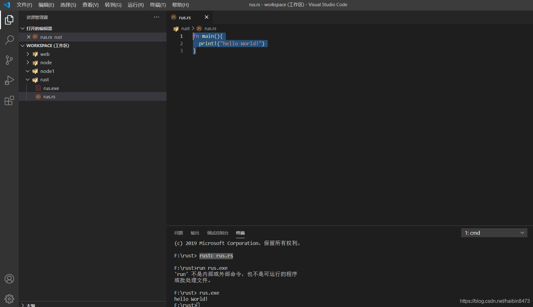 F:\rust> rustc rus.rs //生成多个文件并合并成exe文件