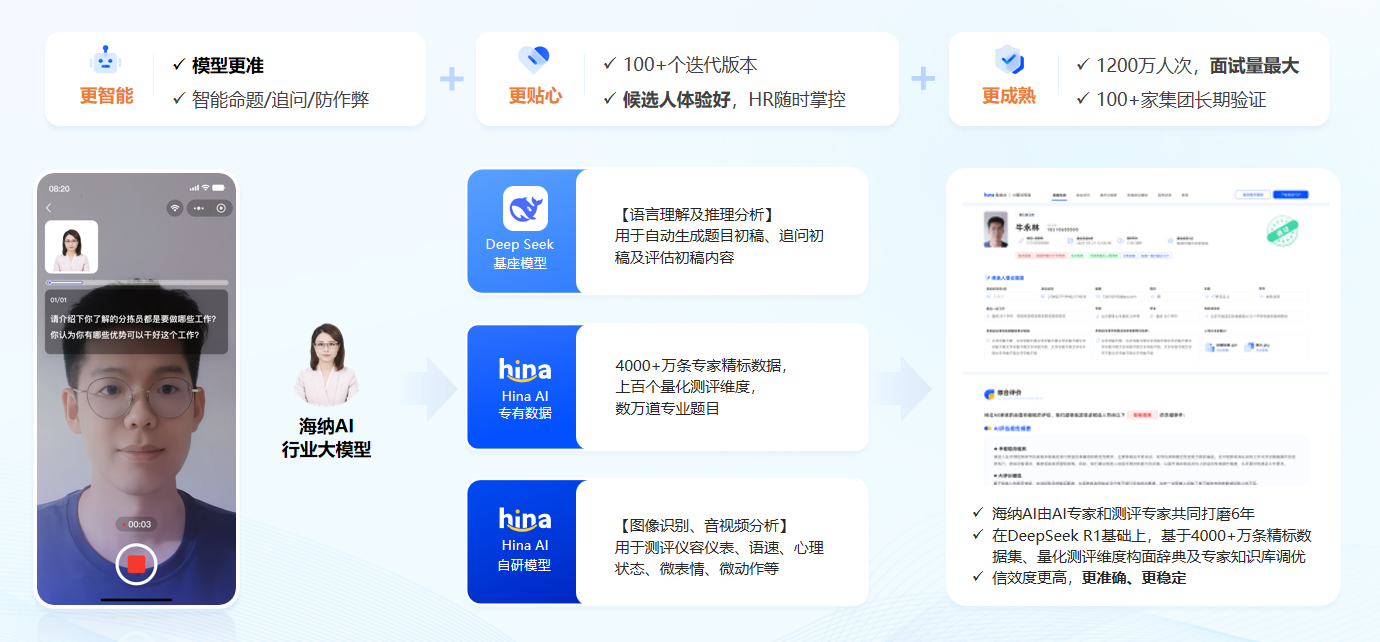 - 模型共建保稳定精准:开拓更多AI招聘大模型的协作伙伴,海纳AI面试官将进一步升级垂直招聘领域的专用模型,共同开发AI人才大模型,建设人才高地;