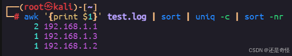 - awk ‘{print $1}’ :默认以空格分隔,提取第一字段(通常是IP)