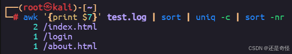 - awk ‘{print $7}’:提取第七字段(通常请求的是URL路径)