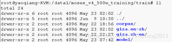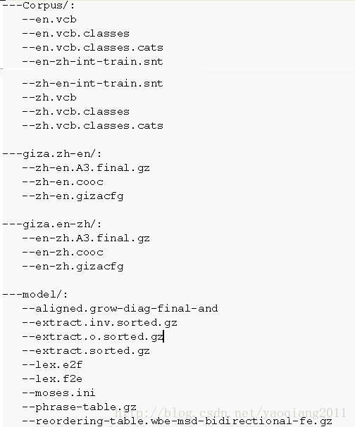 言归正传,首先给大家介绍一下使用moses训练后的目录以及目录下的文件,在调用moses训练命令之后,如果训练全程都很顺利,那么在你的train文件夹下,会有四个文件夹Corpus、giza.zh-en、giza.en-zh、model,其目录下文件如下所示,在后续第2节会介绍每个文件夹中哪些文件分别是训练那个阶段获得的: