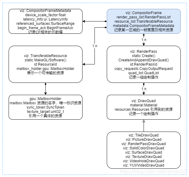 CF 是 viz 中的核心数据结构,它代表某块区域中UI的一帧画面,使用 DrawQuad 来存储 UI 要显示的内容。它代表了 viz 运行时的数据流。
