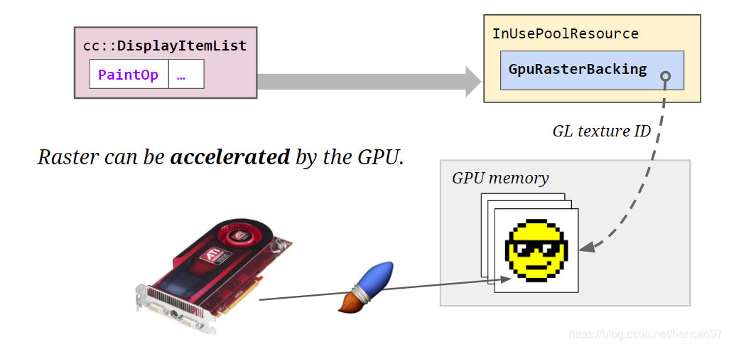 - 过去的GPU只是作为一个内存,这些内存被OpenGL纹理对象引用,我们会将栅格化的位图放到主内存里,然后上传到GPU,用来分担内存压力。