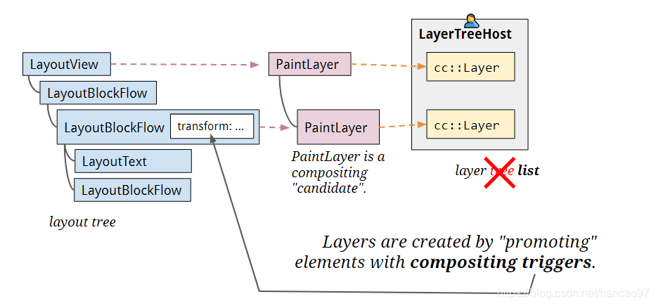 图层化的决策目前是由Blink来负责,根据DOM树生成一个图层树,并以DisplayList记录每个图层的内容。