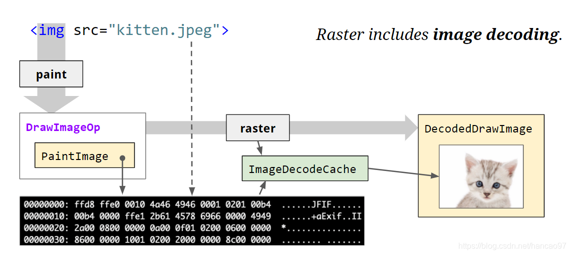 光栅化这个过程还会去解码嵌入在页面中的图像资源,绘制操作会引用压缩的数据(比如JPEG,PNG等等),而光栅化会调用适当的解码器对其进行适当的解压。