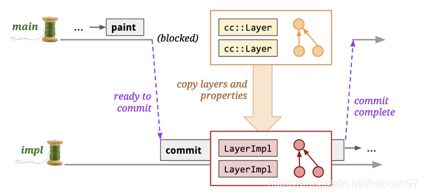 下面就来到了commit阶段,这个阶段会更新图层和属性树的副本到合成器线程。