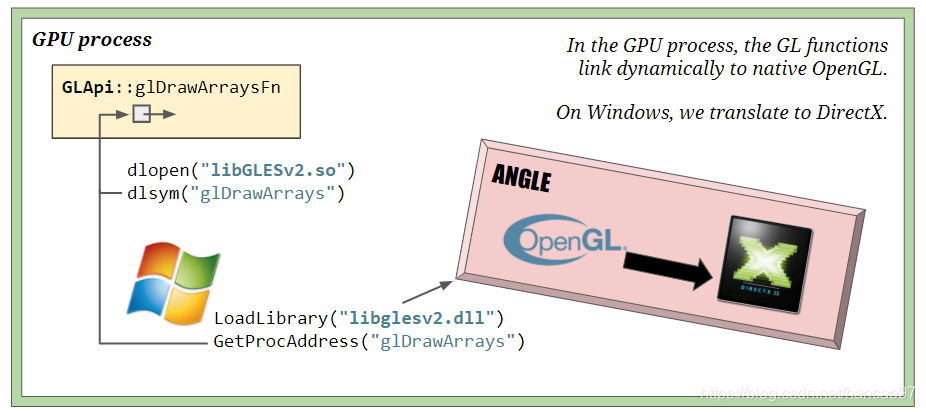 接下来就是去执行GL指令,GL指令一般是由底层的so库提供的,在Windows平台还会被转换成DirectX(微软的图形API,用于图形加速)