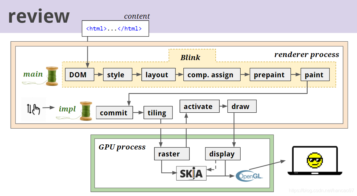 首先,回顾一下,上一篇文章的内容,我们首先介绍了content概念,知道了我们最终要的结果是显示在屏幕上的像素,了解了浏览器渲染的目标【html/css/js 转换到 正确的opengl调用来调整像素的样式】,了解了Style,了解了Layout,了解了Panit,现在所有的绘制操作已经记录在显示项列表(display items)中了,那么现在就可以开始本篇文章的阅读。