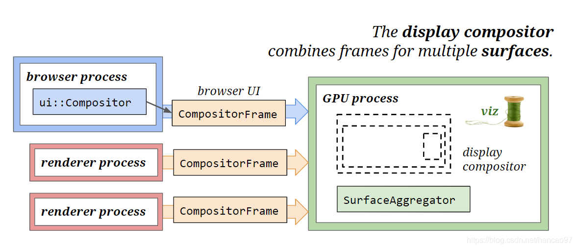 在 Chromium 中 viz 的核心逻辑运行在 GPU 进程中,负责接收其他进程(渲染进程?)产生的 viz::CompositorFrame(简称 CF),然后把这些 CF 进行合成,并将合成的结果最终渲染在窗口上。