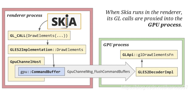 老版本采用了这种方式,Skia是在渲染进程中执行的,他会生产GL调用指令,GPU有单独的GPU process,这种模式下Skia没办法直接进行渲染系统的调用。在初始化Skia的时候,会给它一个函数指针表(这个指针指向了GL API,但不是真正的OpenGL API,而是Chromium提供的代理)。下面的GpuChannelMsg_FlushCommandBuffers是一个命令缓冲区,会将函数指针表转换成真正的OpenGl API。