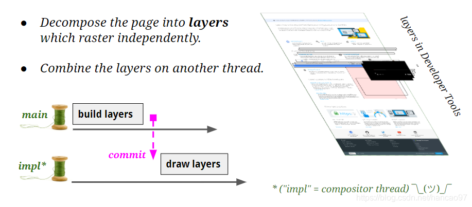 主线程把页面拆分成多个可以独立光栅化的层,并在另一个线程(合成器线程)中将这些层合并。
