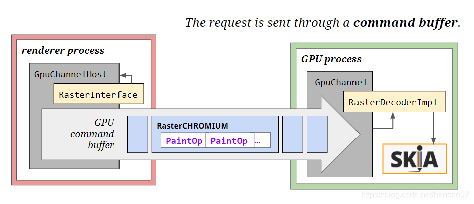 光栅化的绘制操作包装在GPU的命令缓冲区在发送到IPC通道(进程间通信方式)。