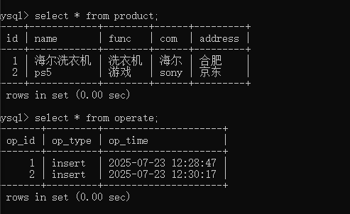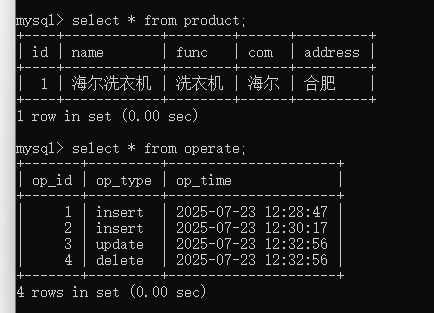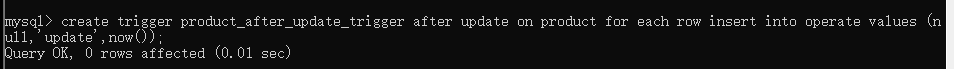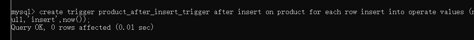 mysql> create trigger product_after_insert_trigger after insert on product for each row insert into operate values (null,'insert',now());