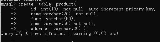 mysql> insert into product(name,func,com,address) value('ps5','游戏','sony','京东');
