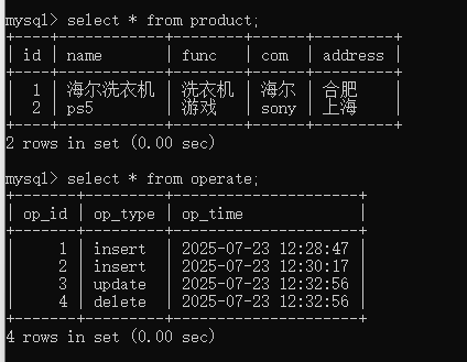注:操作说明:标记执行delete、insert、update2.定义触发器实现在产品表(product)中每更新一个产品,就在操作表(operate)中记录操作方式和时间以及编号记录。