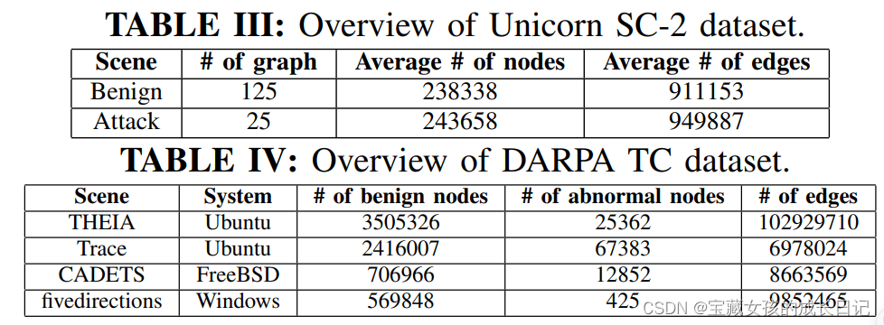 这个数据集是 Unicorn 自己的数据集,比 StreamSpot 数据集更复杂。我们使用它来比较 THREATRACE 的检测性能与 Unicorn 和 ProvDetector。我们不能使用 StreamSpot 进行比较,因为它无法处理大量的边缘。