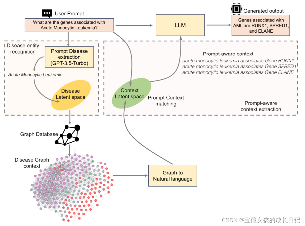 **图5. KG-RAG的详细模式。**虚线框显示了从知识图谱中的“疾病实体识别”和“提示感知上下文提取”中的详细信息。