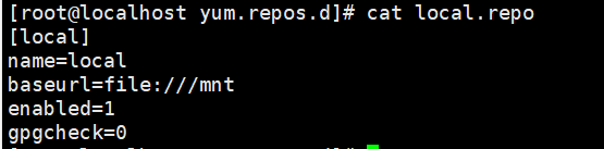 (配置本地仓库文件,baseurl=file:///mnt 是核心配置项,作用是告诉系统:“这个名为 local 的仓库,其软件包的实际存放路径是 /mnt 目录,enabled=1表示启用该本地仓库,gpgcheck=0关闭软件包的验证)