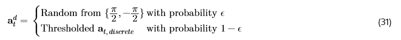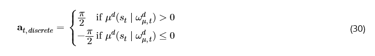 类似地,离散 Actor 策略输出动作,其中阈值处理过程将连续输出映射到离散值 [21]: