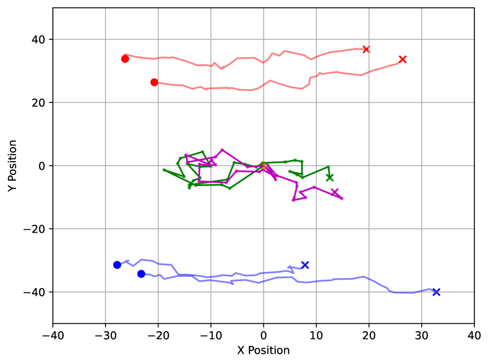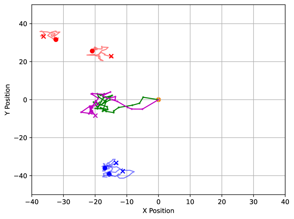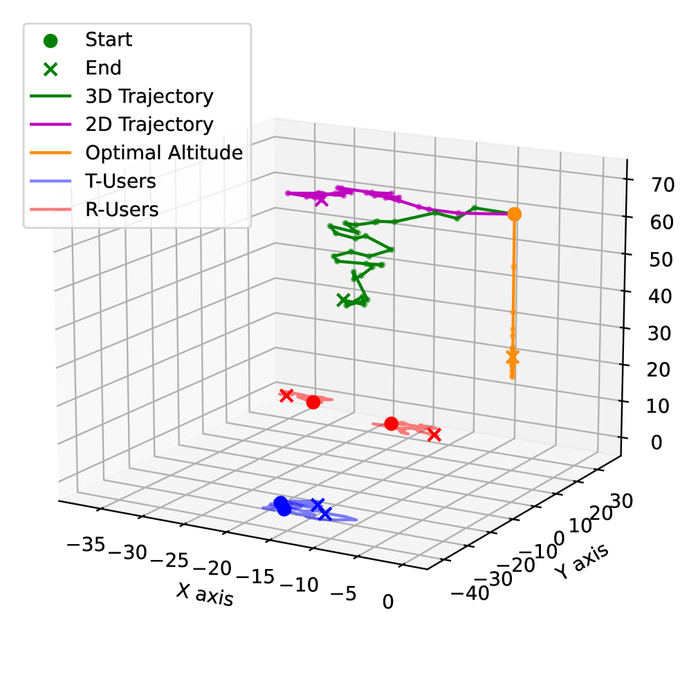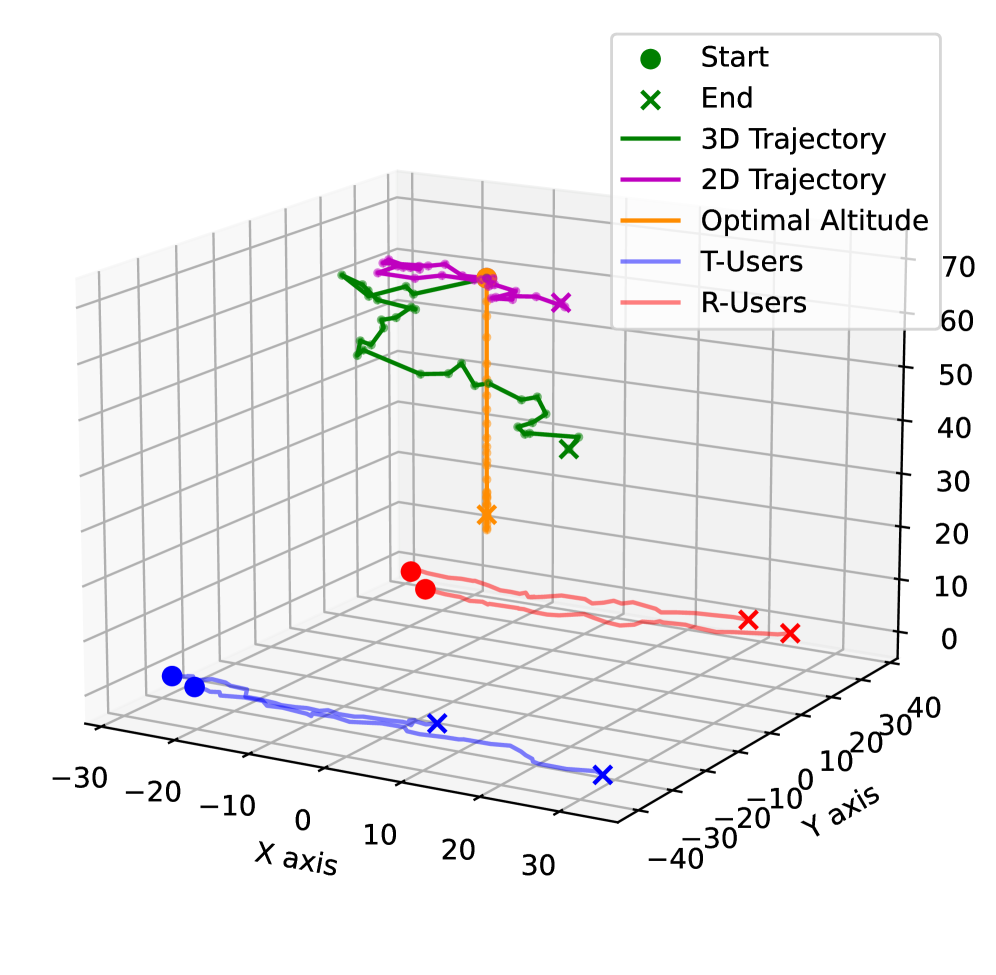 图 7 描绘了各种 Aerial-STAR 部署策略的奖励收敛情况,而图 8 有助于根据用户移动可视化所有轨迹。3D 轨迹策略通过优化 2D 位置和高度,始终获得最高的奖励(比次优策略提高了约 28%),从而最大化吞吐量和公平性。最优 2D 轨迹策略表现出较低的性能,可能是由于增加了天线阻力而没有高度优化带来的增加吞吐量的好处。最优高度策略虽然能够调整高度,但无法优化 2D 位置,导致性能欠佳,原因是增加了垂直移动的功率,而没有水平重新定位以优化吞吐量的补偿效益。固定部署最初由于功耗较低而表现良好,但最终以最低的奖励水平收敛。这突显了节能与通过重新定位适应变化条件和优化吞吐量的能力之间的权衡。这些结果强调了在 Aerial-STAR 系统中 3D 定位的显著优势,其中每个自由度都有助于整体系统效率。