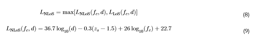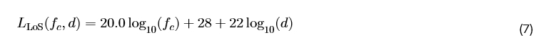 我们采用 3GPP 规范 TR 38.901 [31] 的城市传播模型来求路径损耗 L。以 d 作为源和目的地之间的距离,载波频率 f_c,LoS 链路的路径损耗由下式给出