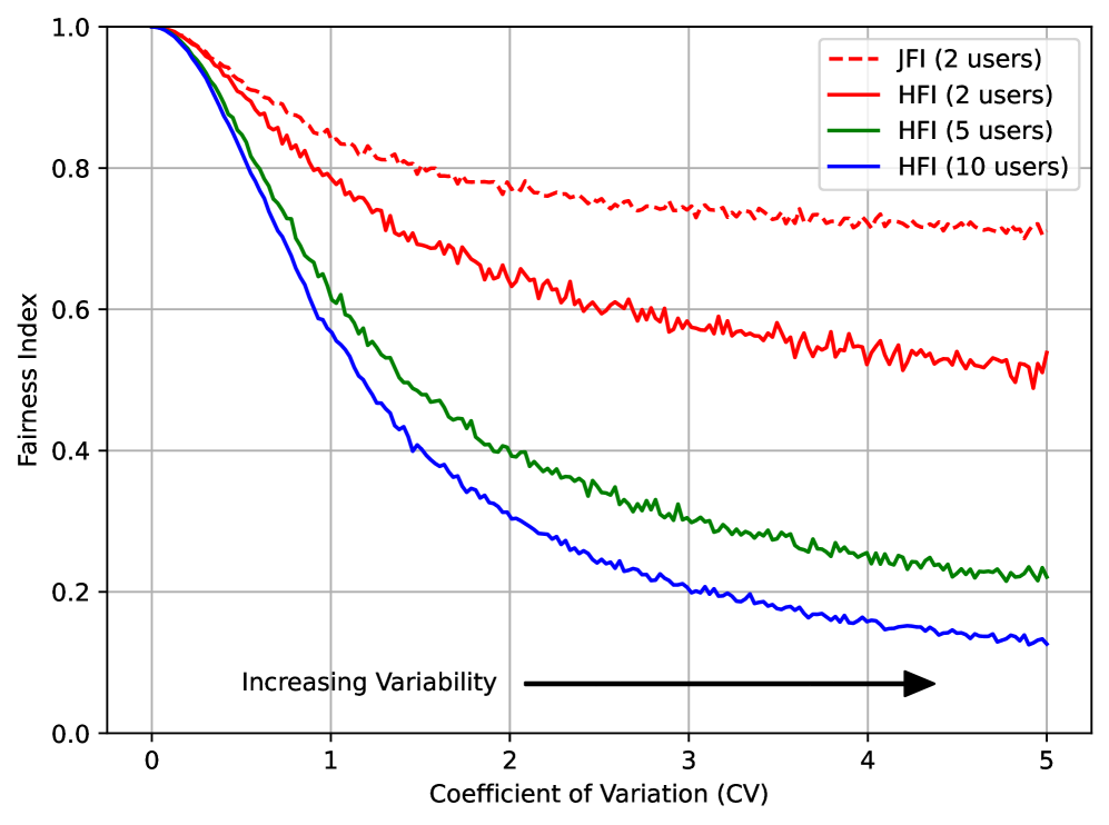 虽然 HFI 和 JFI 都提供了介于 0 和 1 之间的公平性度量(1 表示完全公平),但 HFI 对服务不足的用户提供了增强的敏感性。这是由于调和平均数的特性,即受数据集中较小值的强烈影响。JFI 在高吞吐量差异的场景中往往更宽容。