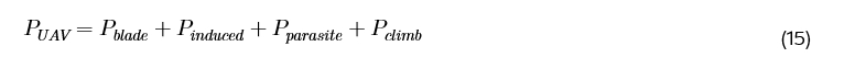 其中 P_blade 指的是叶片轮廓功率,用于补偿转子叶片中的粘性阻力损失,P_induced 是诱导功率,用于克服转子叶片上的诱导阻力所需的能量。此外,P_parasite 是克服无人机机身阻力所需的寄生功率,而 P_climb 是在爬升或下降过程中改变势能所需的功率。这些项的数学表示为: