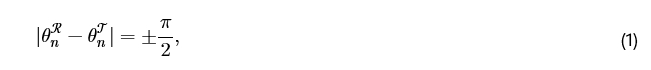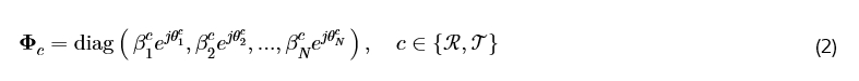 β_n^ℛ 和 β_n^𝒯, n=1,2,…,N 分别代表每个元件对 ℛ 和 𝒯 用户的幅度响应。反射和透射相移表示为 θ_n^ℛ, θ_n^𝒯 ∈ (0,2π]。每个元件的 TRC 表示为 β_n^𝒯 e^{j θ_n^ℛ} 和 β_n^R e^{j θ_n^R},并且需要为无源波束成形进行优化,这是非平凡的,因为每个元件的 TRC 由其阻抗控制。对于一个无源无耗 RIS [7],能量守恒定律要求 β_n^ℛ = √(1 - (β_n^𝒯)²)。相移通过关系 cos(θ_n^ℛ - θ_n^𝒯) = 0 耦合,并遵循