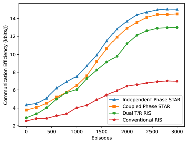 图 10:STAR-RIS、双 T/R RIS 和传统反射 RIS 训练时的通信效率图。
