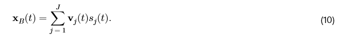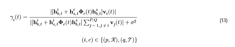 BS 处的波束成形矩阵由 W_B(t) 给出。令 s_j(t) 和 v_j(t) ∈ ℂ^{M×1} 分别表示用户 j 在 BS 处的信息序列和主动波束成形向量。BS 在时隙 t 发射的信号为: