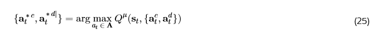 DA-DDPG 算法利用两个独立的 Actor 网络:一个用于连续动作,一个用于离散动作。这些网络并行运行,但通过评论家网络联合训练。状态被输入到连续和离散 Actor 网络,这些网络输出连续 (a_t^c) 和离散 (a_t^d) 动作: