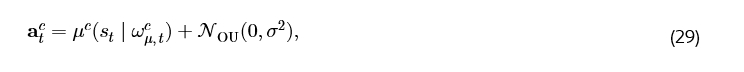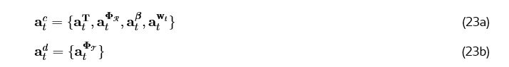 其中 𝒩OU( 0, σ^2 ) 是 OU 噪声 [39],均值为 0,方差为 σ^2,被添加以鼓励在连续动作空间中进行探索。随着训练的进行,噪声会衰减以利于利用(exploitation)。然后,at^c 被映射到智能体要执行的动作 (23a)。Aerial-STAR 轨迹包括 {V, θT, φT},这是在约束 (21g) 下的行进距离,以及俯仰角和方位角上的运动角度,满足 -π/2 ≤ θT ≤ π/2 和 0 ≤ φT ≤ 2π。at^{𝚽^ℛ}, at^{𝜷}, at^{wt} 中其他连续输出的映射分别按照 (21c), (21e) 和 (21g) 进行。