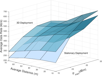 图 9 揭示了搭载在无人机上的 STAR-RIS 与其固定部署的对应方案在变化的 P_max 和 STAR-RIS 与用户之间的平均距离下的通信性能差异。尽管图 7 已经讨论了 3D 部署在奖励累积方面的优越性,但重要的是要注意奖励函数包含了无人机功耗。实际上,固定的 STAR-RIS 很可能安装在固定架构上,因此有必要将其与无人机功耗脱钩。我们的分析强调了奖励改进中有多少可归因于卓越的通信性能。在用户距离和基站最大发射功率的各种场景下,3D 部署由于其能够在三维空间中优化位置而始终优于固定部署。对于增加的 P_max 和平均距离值,3D 部署保持其优越性。对于最低距离和功率组合,3D 部署的性能比固定部署高 38%。应注意,这种性能差距在更高功率和更大距离下会缩小——对于最高距离和功率组合,仅缩小到 4%。在后一种场景中,Aerial-STAR 微小位置调整的影响相对于较大的用户-无人机距离变得不那么明显,高度优化成为主要区别因素。此外,随着发射功率增加,固定部署 RIS 的扩展范围进一步最小化了两种方法之间的性能差异。可以得出结论,Aerial-STAR 部署可能优于固定部署,特别是当 ℛ 和 𝒯 区域的用户距离不是非常远时。