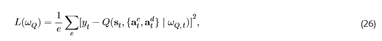 我们的方法使用两个参数化的 Actor 函数 μ_c( s | ω_μ^c ) 和 μ_d( s | ω_μ^d ),以及一个 Critic 函数近似器 Q( s, {ac, ad} | ω_Q )。我们通过最小化以下损失函数来训练 DA-DDPG 智能体: