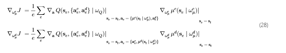我们使用从 Critic 网络导出的策略梯度来训练 Actor 网络,如 (28) 所示,其中 ∇{ω_μ^c} J 和 ∇{ω_μ^d} J 分别是连续 Actor μ_c 和离散 Actor μ_d 的策略梯度,se 和 ae 代表从经验回放缓冲区中采样的状态和动作。